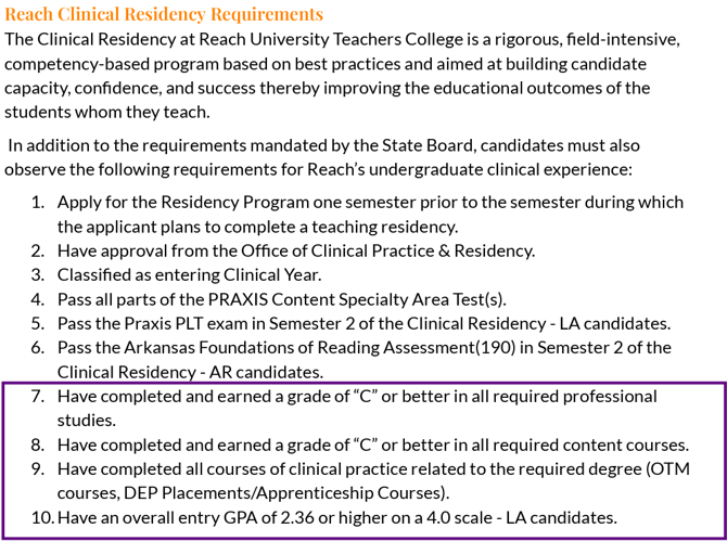 If you don’t meet the Clinical Year requirements, you can still graduate from Reach with a Bachelor’s in Liberal Studies. However, you’ll need to pursue licensure through an alternative certification program (LA) or pathway (AR) after graduation. Reach out to your dedicated advisor or RTC@reach.edu for support if you have more questions.