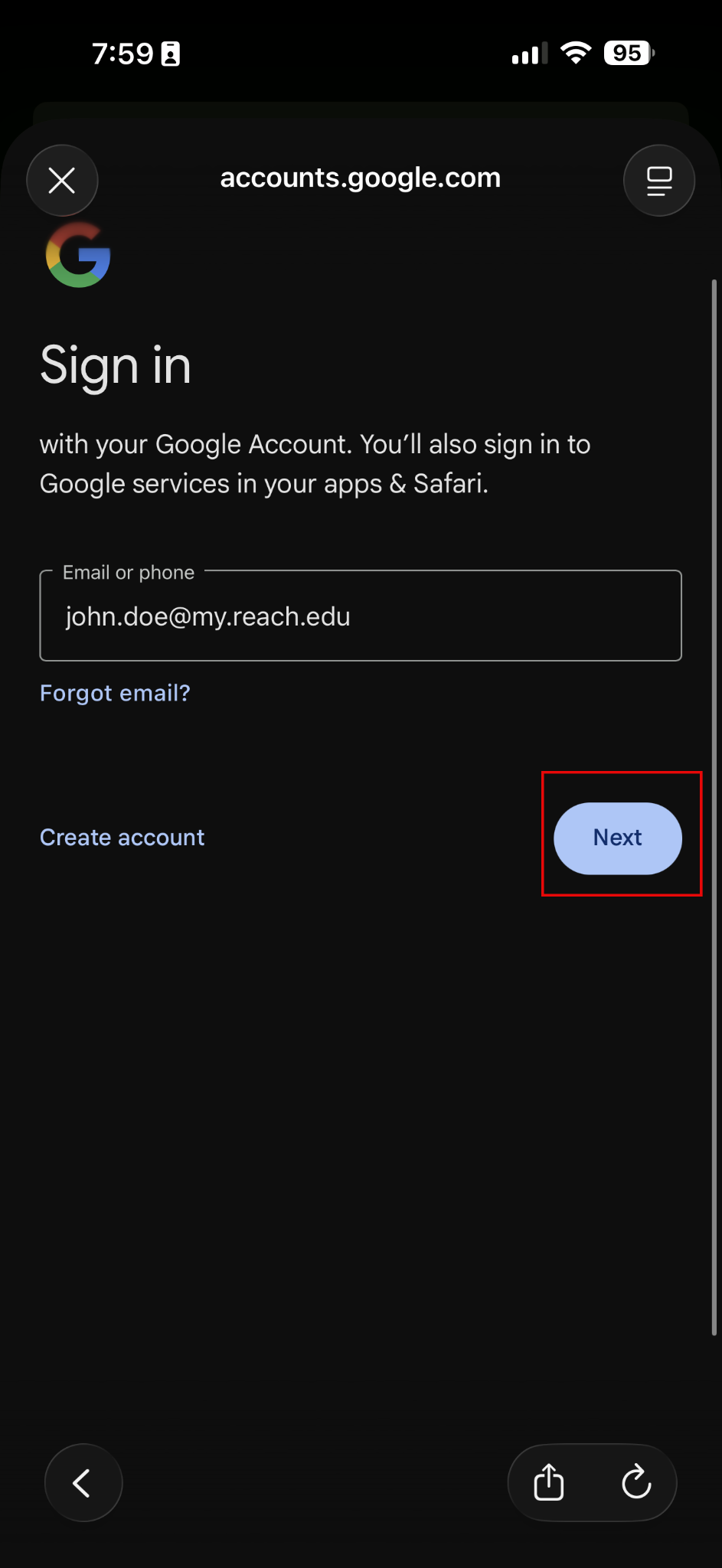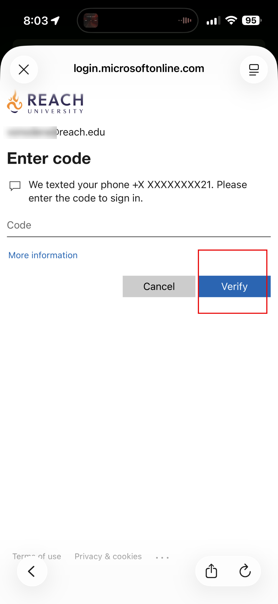 6. A white Microsoft screen branded Reach University will open. Put in your email address.