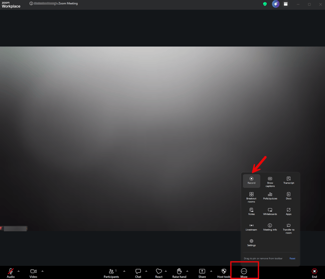 2. Once the call is joined, you will locate the ‘Record’ button on the bottom taskbar or under the three dots labeled ‘More’.