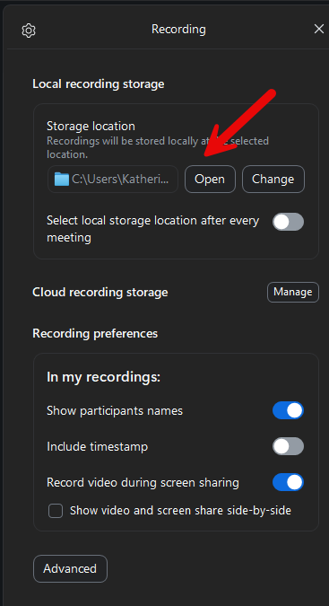 Once you click on ‘Recording’, you will see ‘Local Recording Storage’. Click Open.