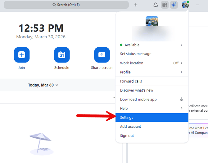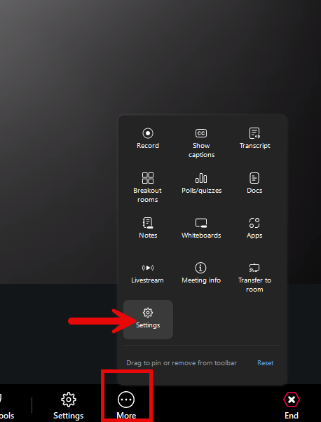 First, you can do this in your meeting by selecting the three dots button labeled ‘More’, then clicking ‘Settings’. Then click ‘Recording’.
