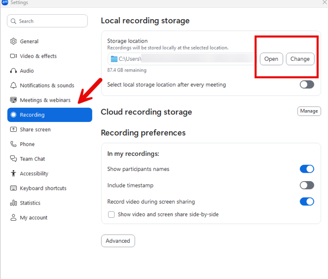 Click ‘Recording’ on the left-hand side, and at the top, you will see your Local Recording Storage. From here, you can open the recording storage location or change it if you do not like its current setting.