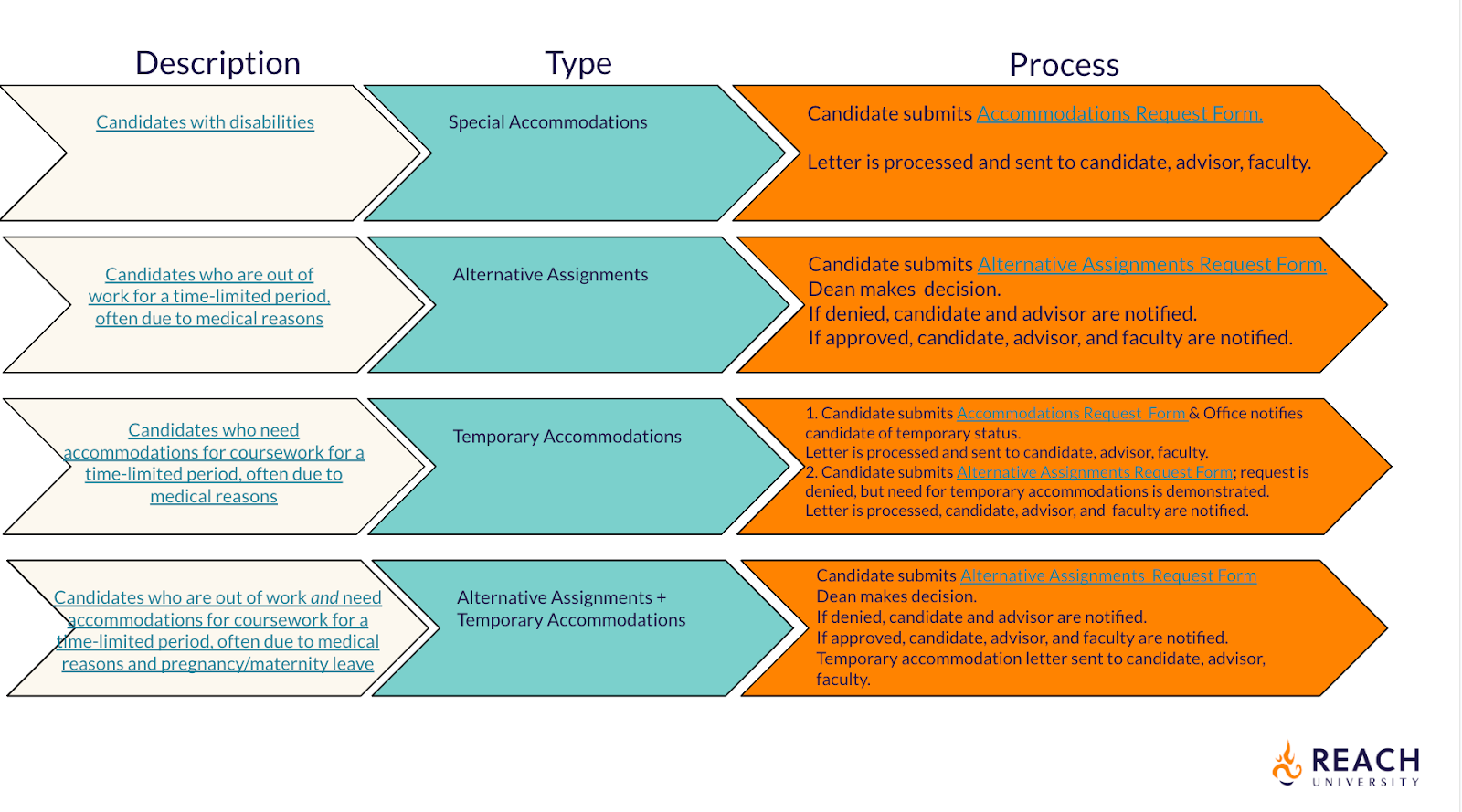 The image below illustrates the different processes candidates may request through the Office of Accessibility.